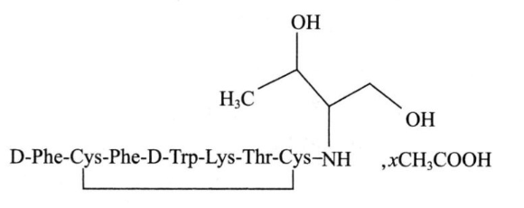 化学名称:醋酸奥曲肽,D-苯丙氨酰-L-半胱氨酰-L-苯丙氨酰-D-色氨酰-L-赖氨酰-L-苏氨酰-L-半胱氨酰-L-苏氨醇环(2→7)二硫化物醋酸盐