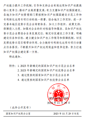按照《国家知识产权局办公室关于面向企业开展2023年度知识产权强国建设示范工作的通知》(国知办函运字〔2023〕572号)要求,经企业测评、推荐上报、审核确认并向社会公示等程序,公司被国家知识产权局认定为2023年度国家知识产权优势企业。